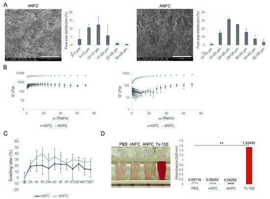 Properties of nanofibrillar cellulose (NFC) hydrogels. (A) Structural analysis and pore size distribution by scanning electron microscopy. The values are the mean ± standard deviation (SD) (n = 2–3). Scale bars, 200 µm. (B) Storage (G’) and loss modulus (G”) of NFC hydrogels (mean ± SD, n = 3). (C) Swelling ratio of NFC hydrogels in phosphate buffered saline (PBS) at +37 °C up to 21 days (mean ± SD, n = 5). (D) Hemolytic activity of NFC hydrogels (mean ± SD, n = 5). PBS and 2% Triton X-100 (Tx-100) were used as the negative and positive control, respectively. ** p < 0.01 Tx-100 vs. PBS, native NFC (nNFC) and ANFC. ANFC, anionic NFC; nNFC, native NFC.