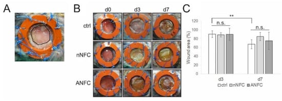 Mice were anesthetized with isoflurane inhalation, and Buprenorphine (0.05 mg/kg) [] was administered subcutaneously before surgery. The dorsal hair of the animals was shaved on either side of the spine, and the skin was disinfected with chlorhexidine, and sterilely draped. On the shaved dorsal surface, two full-thickness 6 mm-diameter circular excisional wounds were surgically created, one on either side of the spine. A sterile donut-shaped splint (outer diameter 14 mm, inner diameter 10 mm) fabricated from a 1.6 mm thick silicone sheet (Grace Bio-Labs, Bend, OR, USA) was then sutured with eight sutures using 4-0 Ethilon nylon sutures (Ethicon US LLC, Somerville, NJ USA) onto the surface of the skin surrounding the excision. Sterile native 1.5 w/w% NFC hydrogel and sterile 3.2 w/w% ANFC hydrogel were applied topically from a sterile syringe to the wound area at a volume of 100 µL. Control wounds were left untreated. All the wounds were covered with a transparent Tegaderm Film dressing (3 M Health Care, St Paul, MN, USA) that was sutured on the silicone splint. Subsequently, wounds were covered with a gauze sutured on the skin, owing to difficulty of keeping the dressings in place. Animals were observed until they fully recovered from anesthesia. After surgery, pain relief was provided for all animals via subcutaneous injection of Buprenorphine (0.05 mg/kg) twice daily for three days.