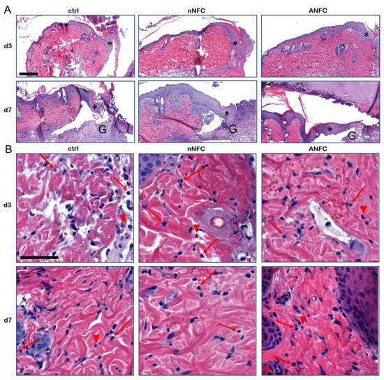 Representative hematoxylin and eosin staining images of wounds treated with native nanofibrillar cellulose (nNFC) and anionic NFC (ANFC), and untreated control. (A) On day 3, the epithelium at the wound margins exhibits mild to marked hyperplasia (asterisk). On day 7, the wound margin epidermis shows moderate to marked hyperplasia (asterisk). Some granulation tissue (G) is present. Scale bar, 200 µm. (B) On day 3, the dermis shows moderate to no mixed inflammatory cell infiltration (mononuclear cells indicated with a red arrow and neutrophils with a red arrowhead) in control wounds, mild to no inflammatory cell infiltration in nNFC-treated wounds and mild mixed inflammation or no inflammatory cell infiltration in ANFC-treated wounds. On day 7, the dermis exhibits mild mononuclear inflammation (macrophages and lymphocytes) in control and mild to moderate mixed inflammation in hydrogel-treated wounds. Scale bar 50 µm. Ctrl, control.