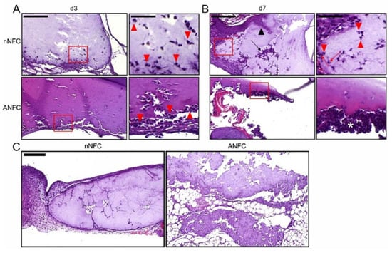Cell infiltration into nanofibrillar cellulose (NFC) hydrogels. (A) Day 3. Native NFC (nNFC) hydrogel shows minimal, mostly neutrophilic infiltration, while there is minimal to moderate but largely superficial neutrophilic or mixed inflammatory infiltration into the anionic NFC (ANFC) hydrogel. Scale bar in the images on the left, 200 µm. Higher magnification with neutrophils marked with red arrowheads is shown on the right, scale bar 50 µm. (B) Day 7. Native NFC hydrogel is invaded mostly by neutrophils (red arrowhead) with few macrophages (red arrow), and small number of mesenchymal cells (black arrow) and epidermal cells (black arrowhead) infiltrating into the hydrogel in some samples. ANFC hydrogel shows minimal to marked infiltrates of neutrophil debris (asterisk). Scale bar in the images on the left, 200 µm. Higher magnification is shown on the right, scale bar 50 µm. (C) On the left, native NFC hydrogel aggregate is enclosed in a layer of fibrin and a loose layer of cellular debris containing neutrophils, macrophages, and mesenchymal cells. On the right, fragmented ANFC hydrogel covers and submerges inside the adipose tissue. Scale bar, 200 µm.