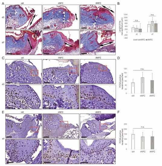 Concomitantly with the inflammation phase, the wound healing continues with cell proliferation that facilitates the growth of a new epithelium and the granulation tissue. We observed hyperplasia to be present in the epithelium at the wound margin in all samples (Figure 3A). Further, we evaluated re-epithelialization in wounds from Masson’s trichrome-stained wound sections by measuring the length of the neo-epithelium, i.e., the layer of keratinocytes growing into the wound area, as indicated by double-headed arrows in Figure 5A. Both native NFC and ANFC showed comparable re-epithelialization at day 3 and day 7 compared with control wounds (Figure 5A,B).