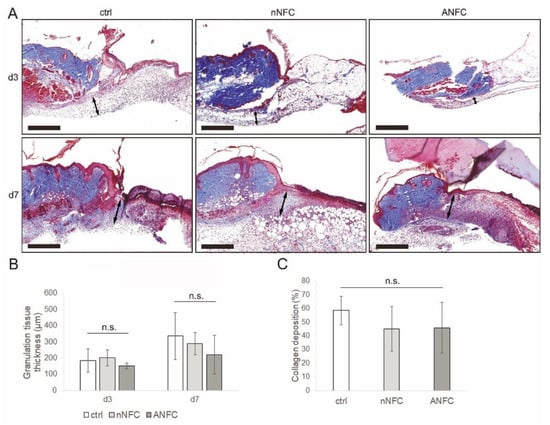Granulation tissue formation in control, native nanofibrillar cellulose (nNFC)- and anionic NFC (ANFC)-treated wounds. (A) Representative images of Masson’s trichrome staining from the wounds showing the granulation tissue on days 3 and 7. The double-headed arrows indicate the thickness of the granulation tissue. Scale bars, 500 µm. (B) Quantitation of granulation tissue thickness on day 3 and 7 indicating equal growth of the granulation tissue in NFC hydrogel-treated wounds compared with control on day 7. The values present the mean ± standard deviation (SD) (n = 4–6). (C) NFC hydrogels do not affect the percentage of collagen deposition in the granulation tissue quantitated from day 7 Masson’s trichrome-stained sections. The values are the mean ± SD (n = 4–5). Ctrl, control; n.s., not significant.