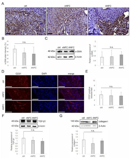 Granulation tissue remodeling and angiogenesis in control, native nanofibrillar cellulose (nNFC)- and anionic NFC (ANFC)-treated wounds. (A) Immunohistochemical (IHC) staining of wound sections with α-smooth muscle actin (SMA) antibody on day 7. Scale bars, 50 µm. (B) Quantitation from IHC staining showing no significant change in expression of α-SMA in the granulation tissue by NFC hydrogels compared with control. The values present the mean ± standard deviation (SD) (n = 4–5). (C) Western blot showing expression of α-SMA in control, and nNFC and ANFC hydrogel-treated wounds on day 7. Quantitation showing the mean ± SD (n = 4–5) is presented on the right. (D) Immunofluorescence staining of CD31 (red) and nuclei (DAPI; blue) in the granulation tissue on day 7. Scale bars, 50 µm. (E) Quantitation of CD31-positive blood vessels from immunofluorescence staining showing no difference between NFC hydrogel-treated and control wounds. The values are the mean ± SD (n = 4). (F,G) Immunoblots and quantitations showing no significant change in the expression levels of TGF-β1 (F) and collagen I (G) in NFC hydrogel-treated wounds compared with control. The values are the mean ± SD (n = 4–5). Ctrl, control; n.s., not significant.
