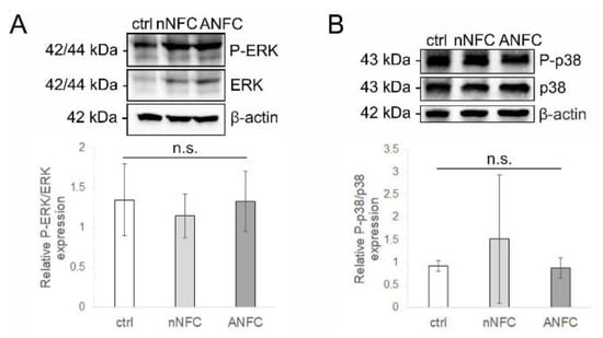 The phosphorylation of extracellular signal-regulated kinases (ERK) and p38 MAPK has been shown to improve wound healing by inducing the proliferation and migration of fibroblasts and keratinocytes [,,]. Thus, we analyzed the phosphorylation state of ERK and p38 MAPK in wound samples by Western blotting. The results show that the phosphorylation of ERK and p38 MAPK in native NFC or ANFC hydrogel-treated wounds are comparable with control wounds (Figure 8A,B), suggesting further that tissue maturation during wound healing proceeds normally in NFC hydrogel-treated wounds.