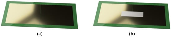 Fully rendered image of pristine (a) and film-coated (b) Si/SiO2 wafer containing 2 gold electrodes separated by a 10-μm channel (rendered in Fusion 360).