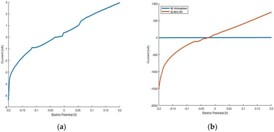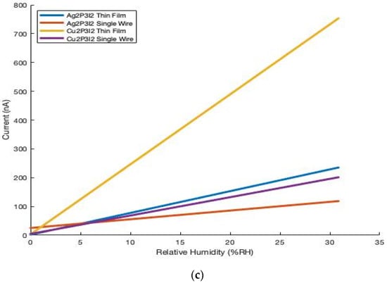 When exposed to relative humidity-controlled atmospheres, the conductivity of the materials increases by orders of magnitude (Figure 3). Each device (200 mV applied potential) displays a dramatic increase in the magnitude of current when exposed to ~30.85% RH (~9745.3 ppm by moisture volume) that was prepared from the vapor of a saturated solution of KF [18], when compared to that of the dry N2 standard. In all cases, the thin films display a greater change in current in response to RH, suggesting these devices to be more sensitive than their single-wire analogs (Table 1). The potential influences the thin film process may have on electronic properties (i.e., grinding, sonication, solvent suspension, etc.) has not been assessed in this work and will be investigated in a future study.