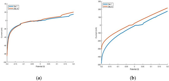 As expected, thin film and single-wire devices of the two materials, Cu2P3I2 and Ag2P3I2 were tested and proven to maintain their conductivity reliably in air. The conductivity remained largely the same in all cases after at least 10 days for Cu2P3I2 (Figure 5), which is similar to that of Ag2P3I2. As mentioned in the introduction section, one of the greatest drawbacks of pure phosphorus-based materials applied as sensors is their low stability in air. Over a time of 10 days, other phosphorus-based materials suffer oxidation, resulting in a significant decrease in conductivity [1]. Owing to its isolation and strong atomic interactions, oxidation is prohibited in the Cu2P3I2 and Ag2P3I2 materials, since P interacts strongly with metal iodides.