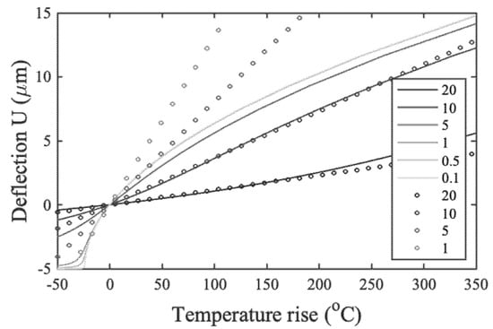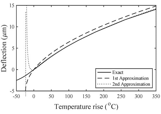 Equation (11) was the desired closed-form solution. It yielded a real result even when was negative until . Figure 3 compares the exact (axial stress included) and approximate (axial stress ignored) variation of the deflection with the average temperature rise for the same parameters as Figure 2 but with only the smallest beam width (, for which ). The agreement was excellent and the closed-form analytic formula tracked the exact solution closely, even when the deflection was large. Other curves are superimposed on this figure; these are discussed later.