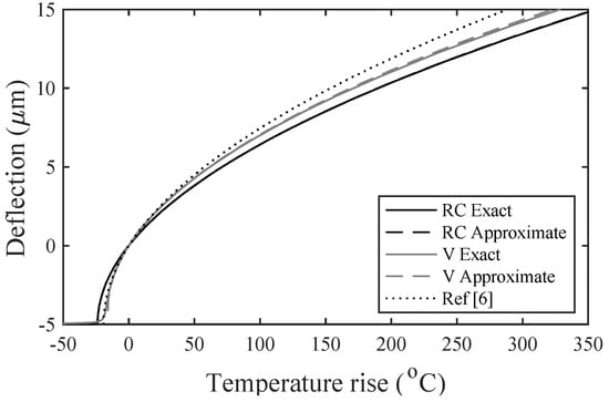 Comparison of the exact and approximate variations of deflection with the average temperature rise for raised cosine (RC) and V-beam actuators (V), with , , , , and . Also shown are the predictions of [].