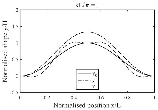 Here, . This result demonstrated a special quality of the raised cosine pre-buckle: the deflected shape did not change. The midpoint deflection was: