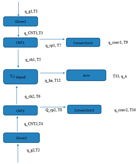 In the glove system, the hand and arm are linked. The blue boxes here represent various components of the numerical simulation model. Glove 1 refers to the glove’s upper-side outermost layer. Glove 2 is the down-side outermost layer of the glove. CNT 1 is a CNT sheet layer that contacts the palm of the hand. CNT 2 is a CNT sheet layer that contacts the back of the hand. Convection 1 and convection 2 represent the simulation system’s two convection zones. Based on the model system, a simulation matrix with 22 equations was programmed in MATLAB. Solving the equation provides the steady-state heat flows and temperatures throughout the glove [11]. The 22 heat transfer equations for the glove model are given in the Supplementary Materials.