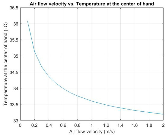 - Next, air flow was added in the simulation system. Also, the convection area temperature was set at 29 °C in this simulation. The air temperature in the external environment, just at the glove location, was set at 60 °C. Figure 2 shows the relationship between the temperature at the center of the hand and different air flow velocities simulated in the model. From Figure 2, the results show that with increasing velocity of air flow, the temperature at the center of the hand dropped. When the velocity increased from 0.1 to 2.0 m/s, the temperature of the hand decreased from 36.1 to 33.2 °C. Thus, the velocity of the air flow should be high to increase cooling, and this depends on the design of the fan. An air flow velocity of 1 m/s reduced the temperature at the center of the hand by 2.5 °C. Increasing the velocity to 2 m/s provides another 0.5 °C reduction in temperature.