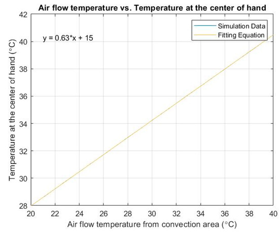 Figure 3. Temperature at the center of hand for different convection area air flow temperatures. The graph shows that a lower air flow temperature from the convection area reduces the temperature at the center of the hand. Simulation and fitting data overlay.The properties of CNT fabric can be customized. One goal is to lower the thermal conductivity through the thickness so the fabric can act as a better thermal insulation material. Another goal is to improve the CNT fabric’s thermal conductivity in the in-plane direction, allowing heat to be spread laterally quickly and then to be removed from the glove by forced convection. There is currently no standard thermal conductivity value for CNT sheets. This is due, in part, to that fact that thermal conductivity is greatly affected by the processing method. The effect of the thermal conductivity of the CNT sheet on the temperature of the hand was investigated using the simulation model. The parameters used were a 2 m/s air flow velocity and a 40 °C convection area temperature. Also, note the convection area temperature is the area in the large cuff of the glove that has cooler air than the air at the hand location outside the glove. A lower temperature in the convection area would require using a cold sink in the cuff of the gloves. The design and practicality of such a cold sink was not investigated in this paper. The air temperature at the cuff of the glove should typically be lower than in the hand area. The sensitivity of transverse and in-plane thermal conductivity was investigated, and the results are described next. - (d)