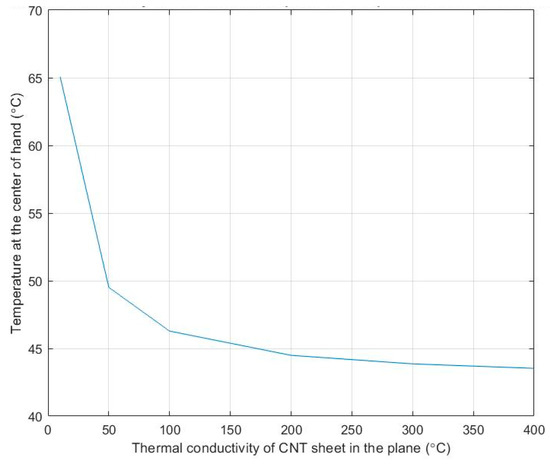 - The temperature of the center of hand with different in-plane thermal conductivities for the CNT sheet is shown in Figure 4. As can be seen in the graph, the thermal conductivity of the CNT sheet has a significant effect in the in-plane direction. However, there is a thermal conductivity maximum value that is optimized. In this case, 200 W (m K)−1 is an appropriate value for the CNT fabric design. This is because, based on the glove materials used, the heat transferred to the glove from the environment can be conducted to the cold sink area with an in-plane thermal conductivity of CNT fabric of 200 W (m K)−1 [11]. Also, all the materials in the glove have low thermal conductivity through the thickness. However, the CNT layer was very thin, so the thermal conductivity effect in the through the thickness direction was small in the simulation compared to the other modes of heat transfer in the glove.