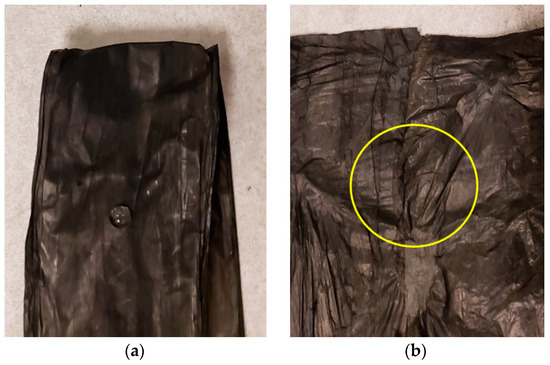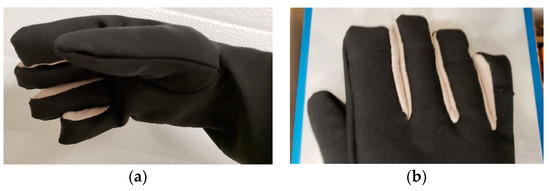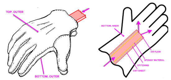 However, in the actual prototype glove that was constructed (Figure 6), a thin inner layer of material was used against the skin. The inner layer prevented the CNT from contacting the skin, which was a safety precaution. In the initial stages of testing the concept of placing CNT channels in a glove, the inner lining of a welding glove was used. This inner lining was made of wool and stitched with cotton. The inner side of the glove lining used was fitted with a CNT sheet that was sewn with a sponge material inside of the CNT and wall of the lining, making a duct that was somewhat resistant to being closed during the normal range of motion from the wrist and fingers.