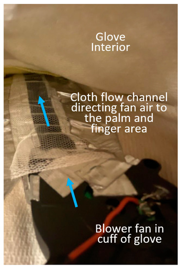 Interior of prototype glove constructed with fan, fabric flow tube, and CNT sheet strip located in the cuff of the glove. Arrows show air flow. No cold sink was used to cool the convection air in this prototype.