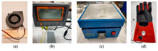 Testing equipment and glove prototype: (a) Cooling blower fan used in the designed prototype glove (WINSINN Blower Fan 12 V 50 mm 50 × 15 mm 5015 DC Brushless Cooling Dual Ball Bearing 0.28 A 3.36 W 6000 ± 5% RPM); (b) gain express four channel thermocouple data logger attached to two k-type thermocouples; (c) ANSA electronic hot plate to act as an external heat source; (d) prototype glove used in the thermal testing. The black hole area is the fan inlet. The silver area is a closed hole used to test the effect of the fan location. The glove was constructed by Mr. Travis Neuendorf.