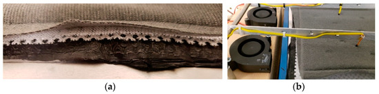 A concept-improved composited nanofabric for use in the nanoglove is shown in Figure 9. The four-layer composited fabric was tested on a hot plate to understand the effect of fan cooling. Ambient room temperature was 15 °C. Two K-type thermocouples, Figure 9b, were used to make the measurements and the two temperatures were averaged. Two blower fans were used (Figure 9b). The temperature of the hot plate with no fabric was 63 °C. The temperature of the top of the fabric (which would be against the skin) was 42 °C for the case with no fan, and 22 °C for the fan-cooled case. The CNT fabric provided heat spreading and also shielding from air contaminants and electromagnetic waves. The fans provided forced convection cooling. Air cooling is the most effective method for cooling. Note the ambient temperature in this testing was 63 °C − 15 °C = 48 °C below the hot plate temperature. If the ambient temperature had been closer to the hot temperature, the cooling effect would have been significantly less. It should be noted there were some sources of error in the testing. The contact pressure of the thermocouple affects the temperature reading. Thus, the two thermocouples were attached to cantilever beams and the beams provided a more uniform contact force to hold the thermocouple tips against the fabric. Also, the hot plate temperature has a variation over the surface due to the location of the heater elements on the inside of the hot plate. The temperature of the hot plate also varies as it heats and cools to maintain the set temperature. Two thermocouples were used, and their average temperature was reported to account for the variation in temperature over the surface of the hot plate. Also, the maximum and minimum temperatures were recorded while the hot plate was holding its set temperature. The measurements were repeated twice. The results reported are thus qualitative. The temperatures measured on the fabric may be in error by roughly ±2 °C. This testing overall indicates that the four-layer composite nanofabric with forced convection cooling may be a new active textile design for construction of protective gloves. A proprietary method was used to join the four fabric layers together. Different fabrics are being investigated to find the optimal composition of the carbon hybrid material or nanofabric for FF applications.