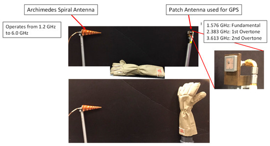 CNT fabric has multi-functional properties for use in textiles, not just cooling. The design and testing of gloves require a cross-disciplinary effort. The radio frequency (RF) shielding of a prototype glove using a full coverage CNT fabric liner was investigated using a simple setup (Figure 10). The measurement of RF shielding effectiveness of the CNT pristine fabric lined glove was performed using an Agilent system analyzer. The CNT fabric was manufactured at the University of Cincinnati (UC) College of Engineering and Applied Sciences. The prototype glove with the CNT liner inside was fabricated at the UC College of Design, Architecture, Art and Planning. The glove was tested at the UC College of Physics. RF signals were sent back and forth between an Archimedes spiral and global positioning system (GPS) patch antennae shown in Figure 10. The transmitted and received signal strengths were measured, both with and without the CNT lined glove placed over the GPS patch antenna. The CNT layer in the glove was about 50 microns thick and added insignificant weight or stiffness to the glove.