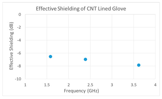 The measured signal levels are shown in Figure 11. The difference in the transmitted and received RF signals, with and without the CNT lined glove placed over GPS Patch antenna, are plotted as a function of frequency modes of the GPS patch antenna. This difference is given in terms of dB. The RF transmitted/received power with the CNT glove placed around the GPS patch antenna was −6.5 to −7.85 dB less than the transmitted/received power without the CNT glove. A glove without a CNT liner was not available for testing but would not provide significant shielding (i.e., would not affect the current test results). A decrease of transmitted/received power of −6.0 dB meant that about ¼ of the RF power permeated through the CNT lined glove. Increasing the CNT fabric thickness would increase the shielding performance. Thus, a thin CNT layer may shield the hand against RF signals received from many sources, such as mobile phones, cordless phones, local wireless networks, radio transmission towers, medical scanners, radar systems, microwave ovens, battery chargers, and military weapons. Shielding the body against RF signals may have positive health benefits.