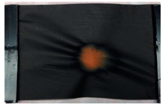 Shielding testing of CNT fabric. CNT pristine fabric also resists flame. A flame is applied to thin CNT pristine fabric. The orange spot shows an iron oxide ceramic secondary phase refractory material that forms due to the flame. The CNT fabric spreads heat from the flame and the orange area resists burning.
