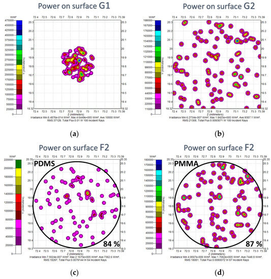 In Figure 3 the radiance maps with the distribution and the percentage of light rays on the surfaces of the waveguide and the output fiber are plotted. For all the maps, an area of 1 mm · 1 mm was considered. The rays distribution in Figure 3a,b are related to the input () and the output () sections of a PDMS-. The smaller diameter of the input fiber than that of the micro-waveguide allows for a good rays confinement inside the micro-waveguide. The same performance was obtained with the PMMA-. The rays distribution in Figure 3c,d are for the output fiber () respectively in the case of PDMS and PMMA . The of rays dispersion obtained in the light transmission is due to the distance d between the waveguide and the fiber, the miss-match due to alignment and the abrupt change of the geometric interface.