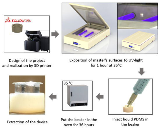 The silicone and the curing agent of PDMS (Sylgard 184 elastomer kit, Dow Corning, Midland, MI, USA) were mixed together according to the proportion (10:1). After the degassing, the PDMS was poured in the master and placed in an oven at C for 36 h. Finally, the PDMS- was peeled from the mold. The master-slave protocol phases and the UV chamber are reported in the flow-diagram of Figure 4.