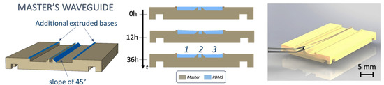 To enable an easy peeling of the PDMS- from the mold, it was necessary to include further optimization of the mold design. Two extruded bases were added, each with one wall inclined with a slope of in proximity of the housing of the waveguide, as shown in Figure 5. This design allows for an auto-cutting process. The PDMS is uniformly distributed inside the site-1, site-2 and site-3, as shown in Figure 5. When the waveguide is removed, only the PDMS in site-2 will be peeled thanks to this process, leaving the remaining PDMS only in site-1 and site-3.