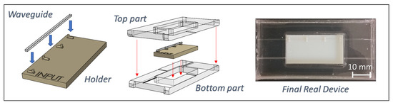 Additionally, a support structure for the PDMS- was realized, in a way that it will be surrounded by air. It was 3D-Printed having 4 pegs designed to touch as little as possible the PDMS to minimize the rays dispersion, see Figure 6a (on the left). In the micro-waveguide realized by Soft-Lithography in previous works [32,33], this problem is not dominant, because the smallest diameter few μm minimizes the effects of rays dispersion. Additionally, for the alignment of the input and output fibers with the PDMS-, two PDMS frames have been used to surround the holder with two slots for the fibers insertions, the same approach used in [21]. In Figure 6 at the center it is shown the mounting scheme and on the right a photo of the complete micro-waveguide system.