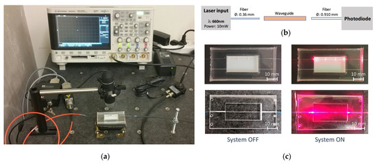 The experimental set-up for the micro-optical systems characterization is shown in Figure 8a. The input light source is a laser system (NovaPro 660-125, RGB Lasersystems, Kelheim, Germany), that generates a light beam with a wavelength of nm and a maximum output power of mW. The output acquisition system consists of a photo-diode (PDA100A, Thorlabs, Newton, NJ, USA) connected with a digital oscilloscope (SDS1102X, Siglent Technologies, Augsburg, Germany). The input and output systems are coupled by multi-mode optical fibers with core diameters μm and .