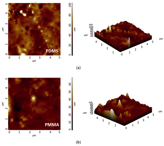 The colormaps of the roughness distributions in 2D and 3D for both the in a square surface of μm side. The color bar reports the surface height in the range nm for the PDMS- (a) and nm for the PMMA- (b).