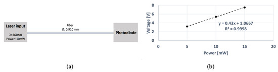 - In condition C1, used for the set-up calibration, the laser light and the photo-diode were directly connected to the acquisition system by an optical fiber (core μm, SMA to SMA, FG910LEC, Thorlabs, Newton, NJ, USA). The input laser power was increased in the set mW and the values of voltages from the oscilloscope were read in order to obtain a calibration curve of the system, as shown in Figure 10b. The plot was mathematically interpolated and a linear increase is worth noticing. In this configuration no causes for light loss are present.