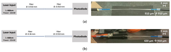 - In the condition C2, used for the set-up optimization, the laser light was coupled initially with an optical fiber with a core of μm and, subsequently with a core of μm, both SMA to free-end (see Figure 11a,b). In both set-ups, those were aligned at a distance of about μm with an optical fiber with a core of μm (free-end to SMA) connected with the acquisition system. In Figure 11 the pictures of both set-ups are shown. Considering an input power laser of 10 mW, the voltage readings, considering the input fiber coupled with the laser with a core diameter of μm and μm, were respectively 3.0 V (losses of ) and 3.6 V (losses of ). The same percentage of losses are present also for the other input laser power, in accordance with the linearity shown in the curve calibration obtained in configuration () (see Figure 10b). The loss was due to the light passage between media at the alignment section. A smaller fiber core diameter at the input than at the output assures minimal losses.