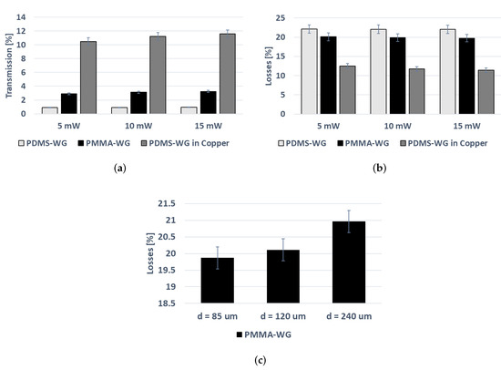 In the bar charts of Figure 13, the transmissions and the losses values, in percentage, obtained for the PDMS and PMMA micro-waveguides are reported. During this characterization phase, the PDMS- and PMMA- were suspended in air. The distance between the fibers and PDMS- at the alignment was set to μm. Based on the three designs realized for the PMMA micro-waveguides, the values of the distance at the alignment were set to {d1 = 85 μm, d2 = 120 μm, d3 = 240 μm}. The performance of the PMMA- and PDMS-, with a distance d equal to μm between the input optical fiber and the waveguide, are comparable. In both cases, good sensitivity to laser power variation is observed (see Figure 13a,b). In Figure 8c, thanks to the PMMA-, with the laser light of 10 mW, it is worth noticing an increase of the losses by enlarging the alignment gap. The losses are around for the PMMA- with μm and around for the PDMS- with μm.