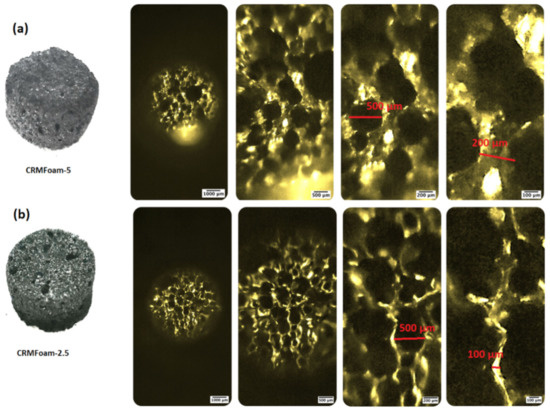Optical images of CRMFoam-5 (a) and CRMFoam-2.5 (b) samples at different magnifications.