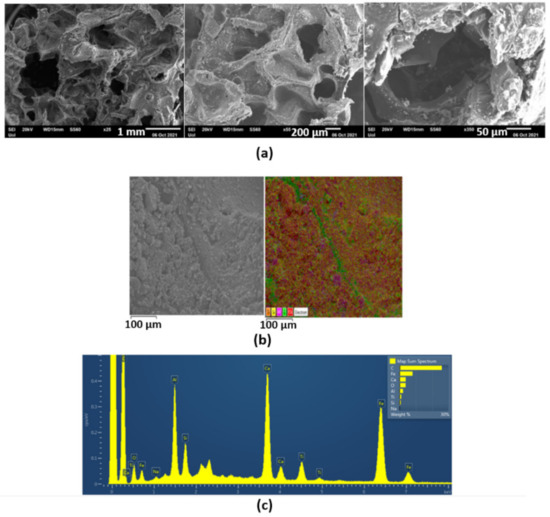 SEM images of CRMFoam-2.5 sample at different magnifications (a). Elemental color mapping at the microstructural level (b) and EDS spectrum (c) showing the distribution of elements and the composition of the foam.