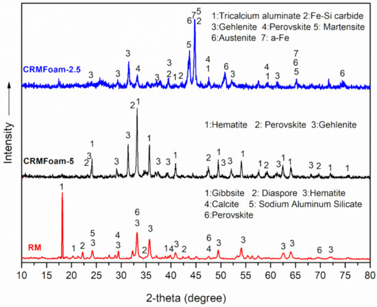 The XRD patterns of the red mud and the CRMFoams, CRMFoam-2.5 (40 wt% in RM), and CRMFoam-5 (20 wt% in RM) are presented in Figure 3. The pattern of RM exhibits a number of sharp diffractions peaks, which can be attributed to crystalline phases of hematite (Fe2O3- main peaks at 32.2°, 35.7°, JCPD file no.: 33-0664), gibbsite (Al(OH)3- main peak at 18.2°, JCPD file no.: 70-2038), diaspore (α-AlO(OH)- main peak at 22.3°, JCPD file no.: 79-178138), calcite (CaCO3- main peak at 29.4°, JCPD file no.: 83-0577), sodium aluminum silicate (NaAlSiO4- main peak at 24.1°, JCPD file no.: 02-0339), perovskite (CaTiO3- main peaks at 33.0°, 47.2°, JCPD file no.: 82-0239).