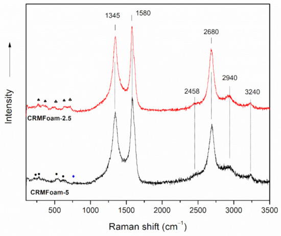 In order to investigate the graphitization degree of carbon foams, their Raman spectra were recorded and analyzed. Figure 4 shows the Raman spectra of CRMFoam-2.5 and CRMFoam-5 materials. Both samples showed similar spectral features, which can be mainly attributed to carbon vibrations. Specifically, the spectra of CRMFoams exhibit all the main Raman peaks corresponding to the graphitized carbon materials: (a) The graphite band (G-band), centered at ~1580 cm−1, which is due to the in-plane motion of sp2 carbon atoms in carbonaceous materials with high degree of symmetry and order (i.e., graphene, graphite, SWNTs) [52,53]. It is extremely sensitive to strain effects and is also a good indicator of the number of graphene layers. [54] (b) The defect activated band (D-band), centered at ~1345 cm−1, which is related to lattice motion away from the center of the Brillouin zone and is usually attributed to disordered carbon (sp3 hybridized carbon), exhibits high sensitivity to the disordered structures. (c) The second order D-band (2D), 2680 cm−1 (exhibits a strong frequency dependence on the excitation laser frequency), which is a second-order two-phonon process Raman signature of sp2 carbons. It is used for the determination of the number of graphene layers, although its behavior is more complex than the frequency shift observed for the G band. (d) The Raman band D + G, at about 2940 cm−1, which is associated with a D + G combination mode that it is also induced by disorder of carbon structure and the two weak bands at 2458 and 3240 cm−1, which are assigned to the combination D + D” and to the harmonic 2D’, respectively (D” corresponds to a phonon belonging to the in-plane longitudinal acoustic branch close to the K point) [52,53]. As it is also observed in Figure 2, the peak positions of the 2D and G bands, together with their intensity ratio (ID/IG ≈ 0.84), for both spectra are well correlated with partially graphitized carbon. In addition, the 2D band profile could provide an indication of the graphitic layers’ number [55]. The symmetric shape of the 2D band suggests the presence of graphitized nanosheets on the surface of CRMFoams. On the other hand, in the low frequency range of the spectra (200–800 cm−1), a number of weak bands are observed, which can be correlated with the vibrations of crystalline oxide and/or iron phases obtained upon pyrolysis of foam preforms, at high temperatures.