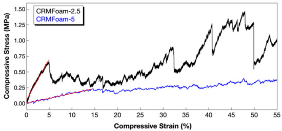 The mechanical performance of the fabricated carbon-red mud foams (CRMFoam-2.5 and CRMFoam-5) was assessed by performing compression strength tests according to ASTM C 1424–99 [56]. Stress-strain curves were plotted (Figure 5) to calculate the compressive strength of foams with different red mud contents (CRMFoam-2.5 contains 40 wt% and CRMFoam-5 contains 20 wt% of RM), and the results are shown in Table 2. It should be noted that both samples were tested at 55% compressive strain, and the compressive strength as well as the modulus of elasticity of all samples were calculated from the linear region (red dotted lines) of the profiles. For better understanding of the RM content-density–compressive strength relationship triangle, the values of foams’ bulk density along with their RM content and compressive strength are being quoted in Table 2.