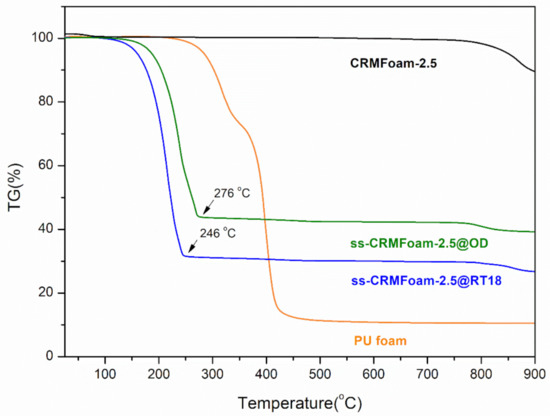 Thermogravimetric analysis (TGA) curves of PU foam CRMFoam-2.5, and ss-CRMFoam-2.5@OD ss-CRMFoam-2.5@RT18 hybrids (OD: Octadecane, RT18: RT18HC).