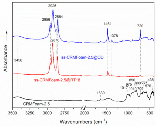 FT-IR spectra of CRMFoam-2.5 and ss-CRMFoam-2.5@OD, ss-CRMFoam-2.5@RT18 hybrids.