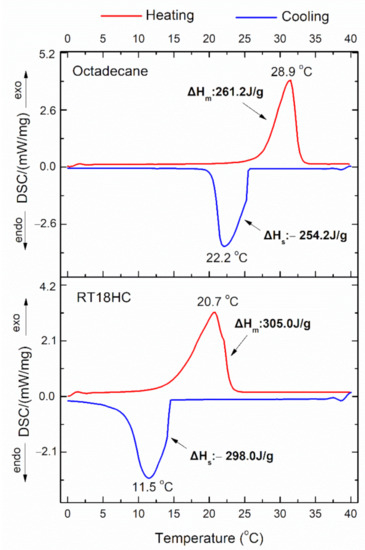 The phase transition properties of PCMs, n-octadecane, and RT18HC were studied using their DSC thermographs. Figure 9 shows the melting-freezing temperatures (Tm, Ts) and the corresponding enthalpies (ΔHm, ΔHs) for the two PCMs. As shown in that figure, the pure n-octadecane melts at 20.7 °C and freezes at 28.9 °C, while RTH18HC melts at 22.2 °C and freezes at 11.5 °C. Both the exothermic and endothermic peaks of two PCMs, were asymmetric, implying the existence of more than one crystalline phase. According to previous studies, the n-octadecane crystals consist of two crystalline phases α- and β, which exhibit very close melting temperatures overlapping each other [67]. The similar asymmetric appearance of DSC peaks of RT18HC, could be explained based on its structure, which seems according to the Rubitherm data sheet [68], to be composed of more than one hydrocarbon (the main phase should be the hexadecane, C16H34). The areas of exothermic (melting) and endothermic (solidification) transition peaks of DSC curves were used for the calculation of enthalpies of n-octadecane and RT18HC, which were found to be 261.2 J/g (ΔHm), −254.2 J/g (ΔHs) and 305.0 J/g (ΔHm), −298.0 J/g (ΔHs), respectively.