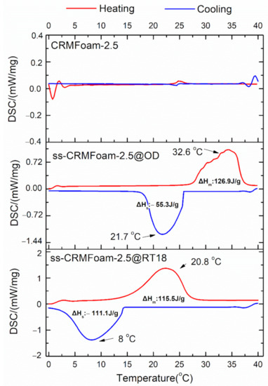 Moreover, Figure 10 shows the melting and freezing temperatures (Tm, Ts) as well as the corresponding enthalpies (ΔHm, ΔHs) of the two PCMs stabilized into CRMFoam-2.5. As shown in that figure, the melting temperature (Tm) of octadecane (OD) increases (+3.7 °C, curve of ss-CRMFoam-2.5@OD), while the solidification temperature (Ts) of RT18HC decreases (−3.5 °C, curve of ss-CRMFoam-2.5@RTH18). The DSC thermograph of CRMFoam-2.5, which is also illustrated in Figure 10, did not show exothermic or endothermic peaks.