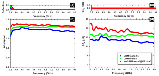 Reflection (a) and absorption (b) spectra from 3.5 to 9.0 GHz (C-band) for different CRMFoams. The electromagnetic interference shielding effect (SE) due to reflection (SER; c), and absorption (SEA; d) can also be seen in the frequency range 3.5–9.0 GHz.