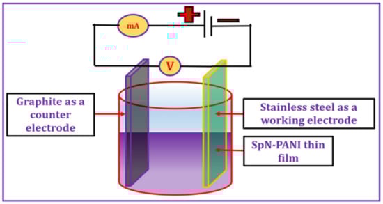 Before electrodeposition of the SpN-PANI thin film, the SS substrate was polished with emery polish paper rough to finish, and further followed by rinsing with water and cleaning with acetone. For synthesis of the SpN-PANI thin film, 0.1 M aqueous aniline solution was added to a 0.1 M aqueous H2SO4 solution. The mixed solution was stirred a few times to prepare a homogeneous solution for electrodeposition. The SpN-PANI thin film was deposited onto SS substrates via the galvanostatic mode of ED at a constant current density of 5 mA for 600 s at room temperature. Figure 1 illustrates the schematic representation of the electrodeposition process for the synthesis of the polyaniline thin film. The as-deposited SpN-PANI thin film is greenish blue in color, indicative of the formation of emeraldine salt of the PANI thin film.
