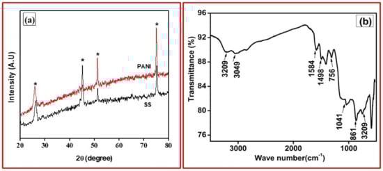 (a) XRD pattern of SS and SpN-PANI thin film, (b) FTIR spectrum of SpN-PANI thin film.