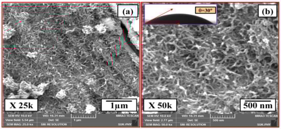The surface morphology features of the SpN-PANI thin film were carried out by using SEM at two different magnifications: 25 kX and 50 kX (Figure 3). It is noteworthy that the electro polymerization of aniline mostly involved two stages. Firstly, a compact granular structure of PANI is formed on the SS electrode in the primary stage. Secondly, PANI further grows and then forms a uniform and loosely bound morphology in the advanced stage, which seems to be a spongy-network-like structure [17]. As can be seen from Figure 3a at lower magnification, the surface of the SpN-PANI thin film is fully covered with a spongy network. The unique spongy-network-like structure with micro-pores is uniformly coated onto an SS substrate. These micro-pores diameters were observed to be in the size range of 300 nm to 500 nm, which is clearly shown in Figure 3b. This spongy-like structure is expected to provide a larger surface area for the electrochemical reaction due to micro-pores which provide a fast flow of charge carriers. These are key requirements in a supercapacitor, which offers a high surface area; it also diminishes the diffusion resistance of the electrolyte into the electrode, thereby enhancing the supercapacitive performance [19]. Surface wettability of the SpN-PANI thin film was examined by performing contact angle measurements, as displayed in the inset of Figure 3b. The value of the contact angle was observed to be 30°, indicating that the SpN-PANI thin film is hydrophilic in nature. The hydrophilic nature of the electrode is helpful for improving the supercapacitive performance. Previously, Dhawale et al. [5] reported that the water contact angle for polyaniline thin film is 15° for supercapacitor application. In the present work, the value of the contact angle is relatively high, and this may be due to the formation of the spongy-network-like structure of the polyaniline thin film.