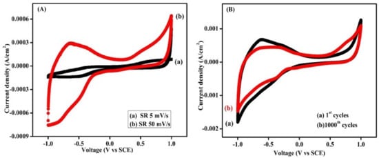 Figure 4A shows typical CV curves of the SpN-PANI thin film at two different scan rates, 5 and 50 mV.s−1, within the potential window of +1 V to −1 V, respectively. It was observed that as the scan rate increased, the current under the curve increased, i.e., current density is directly proportional to scan rate. This also indicates the ideal faradaic supercapacitive behavior of SpN-PANI thin film.