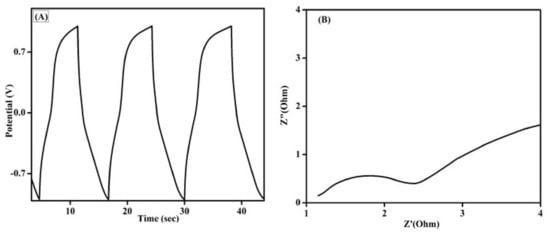 (A) GCD study of SpN-PANI thin film and (B) EIS study of SpN-PANI thin film.