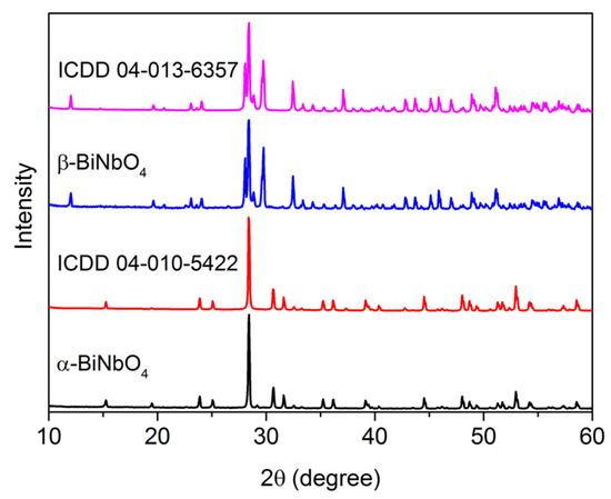 The crystalline phases present in the sintered pellets were identified by the X-ray diffraction patterns, as shown in Figure 2. The crystalline nature of the prepared powders can be revealed by the sharp and high-intensity peaks. In the sample heat-treated at 850 °C, pure α-BiNbO4 was identified, with peaks consistent with the standard ICDD code 04-010-5422 [24]. The sample heat-treated at 1050 °C was proved to be single-phase β-BiNbO4, according to the ICDD code 04-013-6357 [25].
